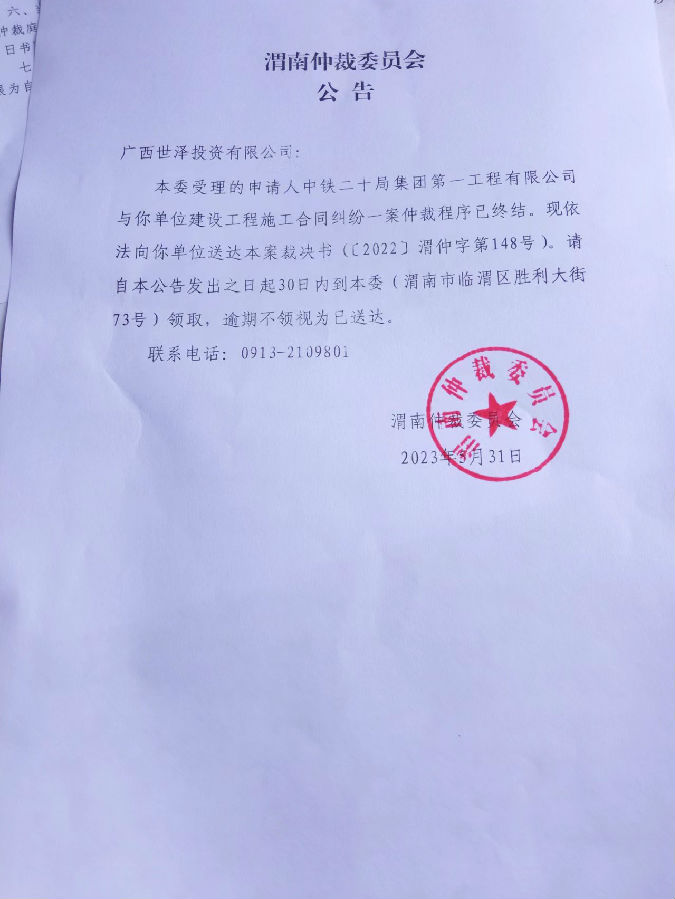 中鐵二十局集團(tuán)第一工程有限公司與廣西世澤投資有限公司一案裁決書公告